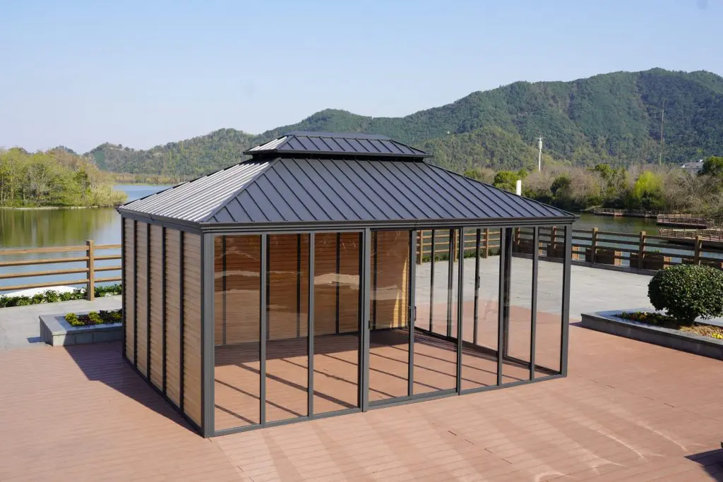 Our 3-season aluminum pavilion. High-quality aluminum sliding doors with integrated screens slide effortlessly and eliminate any concerns about opening and closing doors.